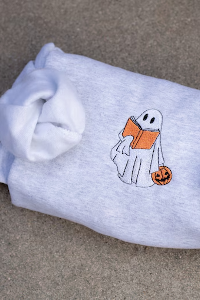 Get cozy with this sweatshirt featuring a boooookish trick-or-treating ghost.