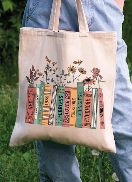 The bookish Swiftie in your life can store friendship bracelets, books, and more in this album-inspired tote. Add in this book lover sticker to give them another surprise!